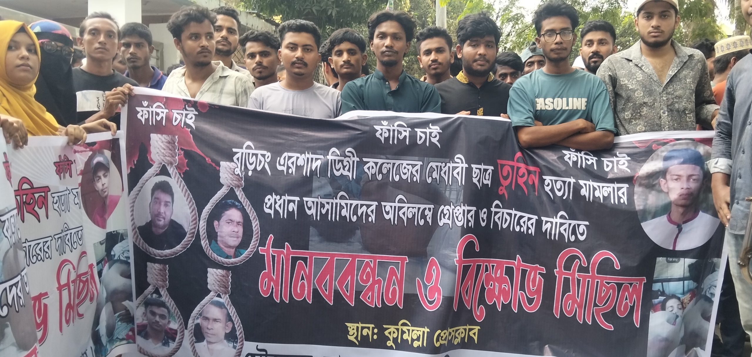 কুমিল্লা বুড়িচং এরশাদ ডিগ্রি কলেজের মেধাবী ছাত্র তুহিন হত্যার প্রধান আসামী ঘাতক সাইফুল ইসলাম বাবুসহ অন্যান্য আসামীদের গ্রেফতারে বিলম্ব হওয়ায় মানববন্ধন ও পুলিশ সুপার কার্যালয় ঘেরাও করেন নিহত পরিবারের সদস্য, সাধারণ ছাত্র-জনতা।