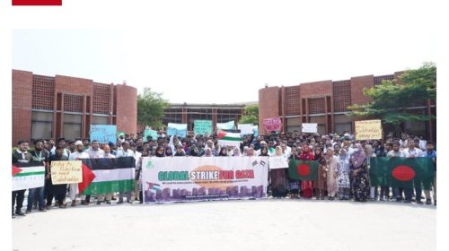 ফিলিস্তিনের গাজা উপত্যকায় ইসরায়েলের গণহত্যা ও দখলদারিত্বের প্রতিবাদে এবং গ্লোবাল স্ট্রাইক ফর গাজার সমর্থনে মানববন্ধন ও দোয়া মাহফিলের আয়োজন করেছে গ্রিন ইউনিভার্সিটির শিক্ষক-শিক্ষার্থীরা।সোমবার (৭ এপ্রিল) বিশ্ববিদ্যালয় ক্যাম্পাসে আয়োজিত এ মানববন্ধন…